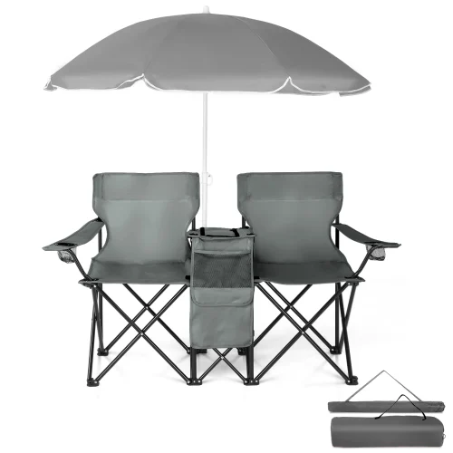 Portable Outdoor 2-Seat Folding Beach Chair with Removable Sun Umbrella Grey