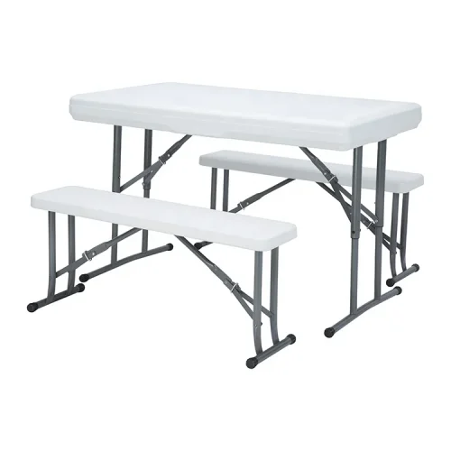 A Simple Set of White Modern Camping Essentials Portable Practical Plastic Desk and Beer Bench Folding Table and Chairs