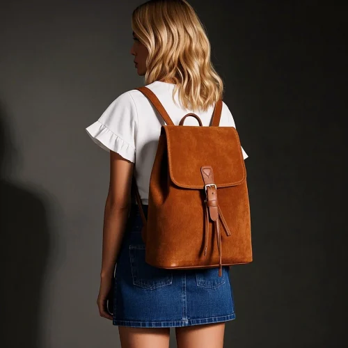 Trendy Tan Brown Soft Calf Suede Genuine Cow Cowhide Leather Portable Back Pack Backpack with Laptop Compartment
