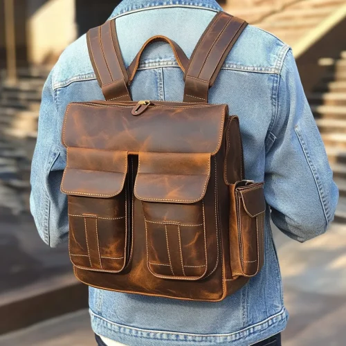 Trendy Multi-pockets Make Premium Quality Crazy Horse Full Grain Leather Backpack Men;s Knapsack for Outdoor
