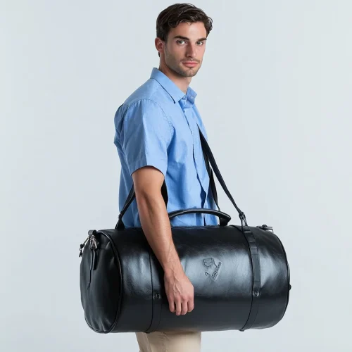 Trendy Men Black Cowhide Genuine Leather Large Size Gym Sports Overnight Duffle Travel Duffel Bag for Weekend Trip