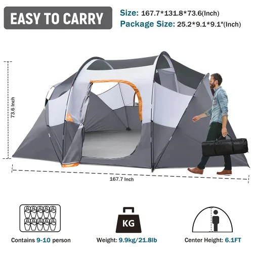 10-Person Camping Tent | Easy Setup Portable Family Dome Tent for Camp, Hiking, Backpacking & Traveling – Dimensions