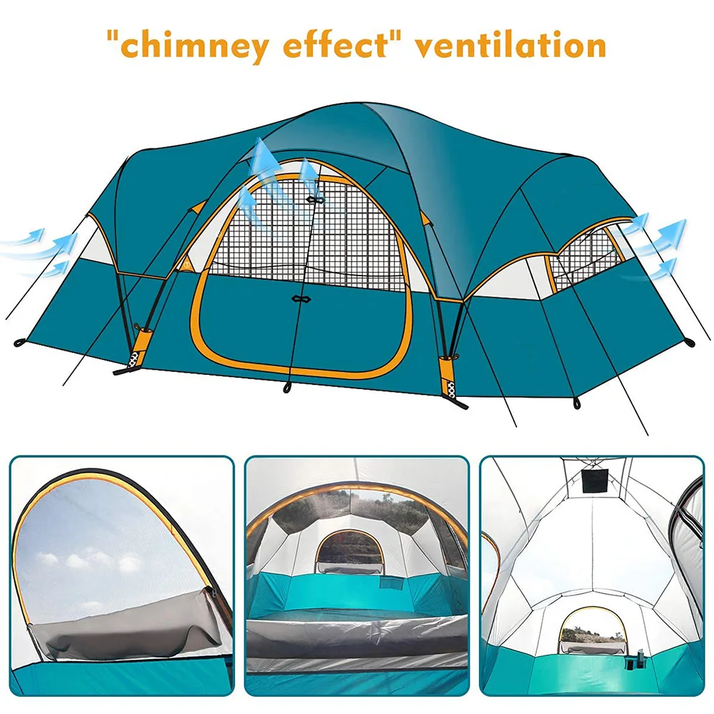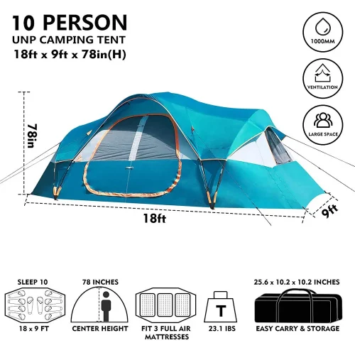 Product Name: 10-Person Family Tent – Easy Setup, Double Layer, 2 Rooms. 5 Large Mesh Windows, Waterproof & Weather Resistant.
