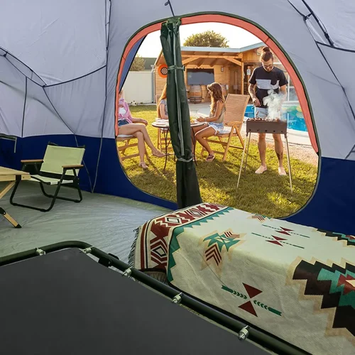 Product Name: 10-Person Family Tent – Easy Setup, Double Layer, 2 Rooms. 5 Large Mesh Windows, Waterproof & Weather Resistant.