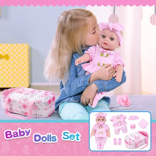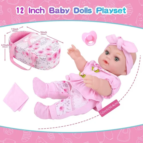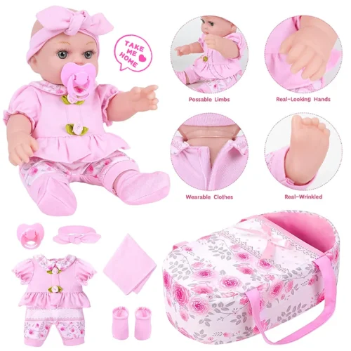 Product Name: 12-Inch Cute Doll Baby Dress Headband Pacifier Sleeping Basket Saliva Towel Socks Suitable Birthday Gift for Both Boys Girls