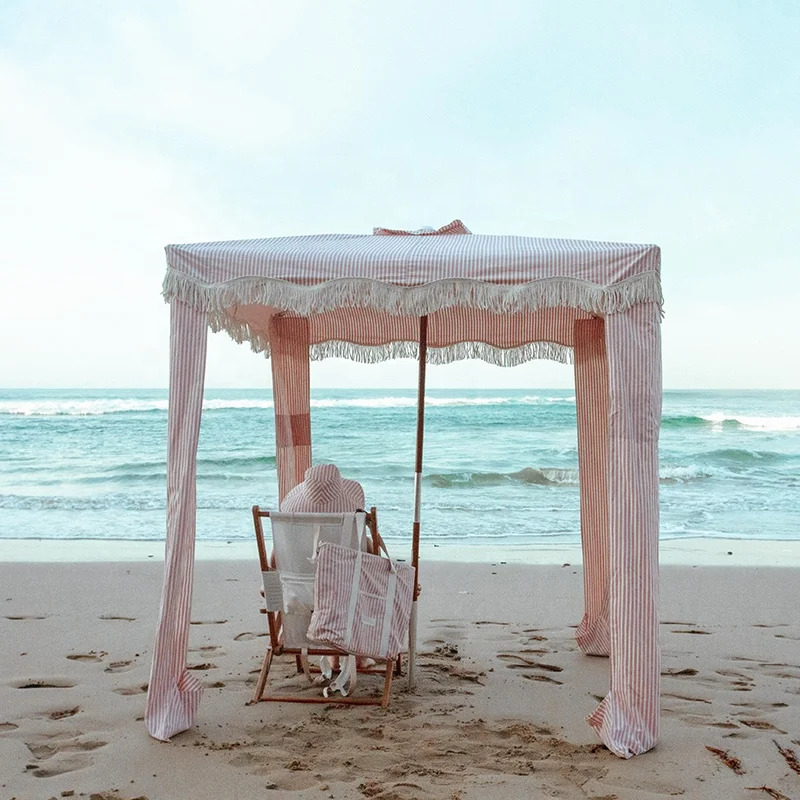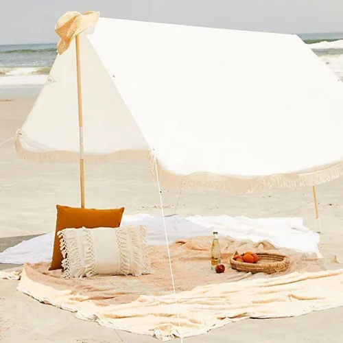 Product Name: 2023 Best Parasols Supplier Trend Boho Beach Sun Shade Wooden Beach Tassels Umbrella and Chair Picnic Set Manufacturer