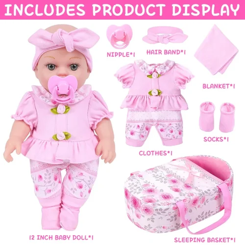 12-Inch Cute Doll Baby Dress Headband Pacifier Sleeping Basket Saliva Towel Socks Suitable Birthday Gift for Both Boys Girls